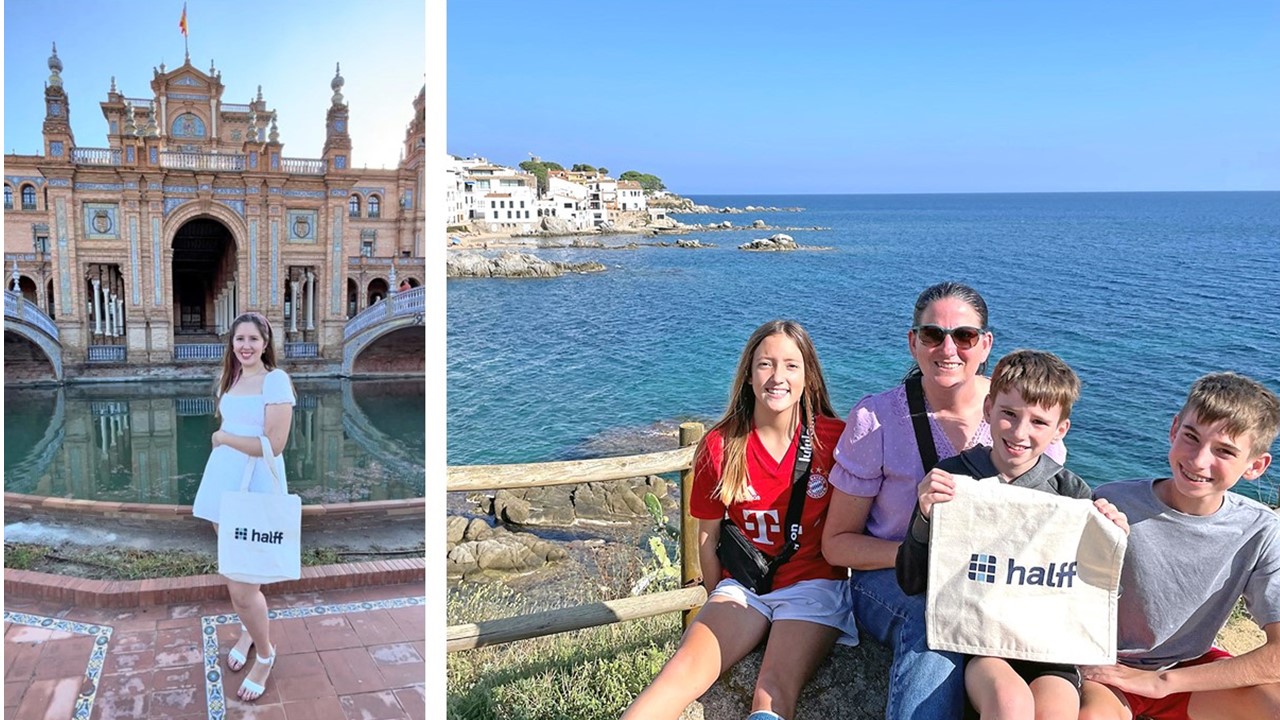 The beautiful country of Spain received lots of love from Halff. Donna Pizzini (left) took her Halff Bag sightseeing in front of the Plaza de Espana in Seville, Spain. Leigh Hollis and her family opted for an ocean view by the Mediterranean Sea in Spain.
